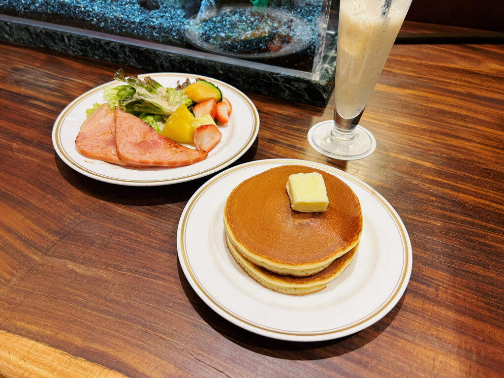 シビタス(蒲田)水槽のある喫茶店のカウンター席で、スナック・ホットケーキとバナナジュース